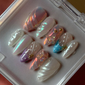Step into elegance with Butterfly Fantasy, a stunning handmade press-on nail set featuring pastel pink and blue ombre with an iridescent glow. Adorned with delicate 3D butterflies and refined gold accents, this design offers a dreamy, high-fashion look for any occasion.