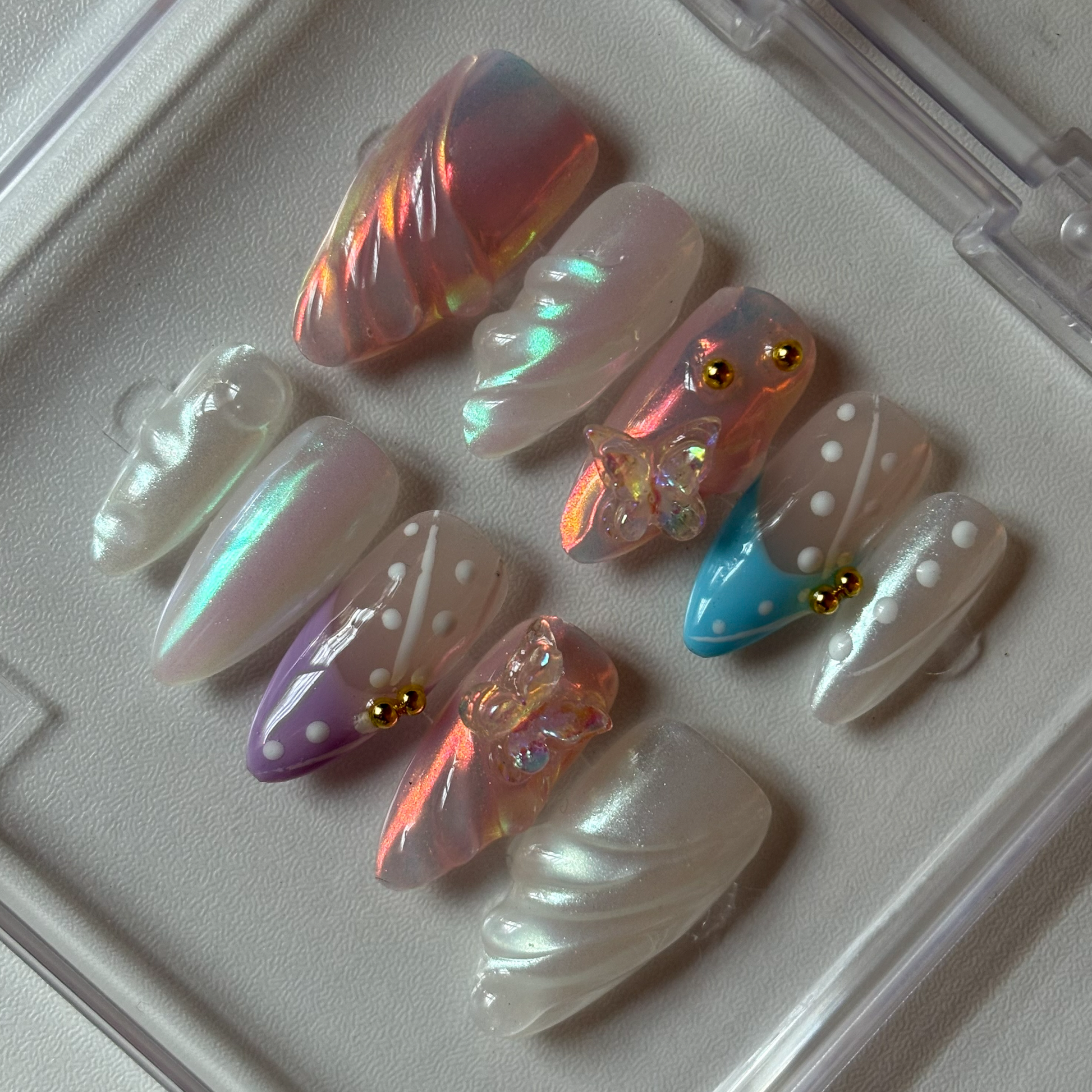 Step into elegance with Butterfly Fantasy, a stunning handmade press-on nail set featuring pastel pink and blue ombre with an iridescent glow. Adorned with delicate 3D butterflies and refined gold accents, this design offers a dreamy, high-fashion look for any occasion.