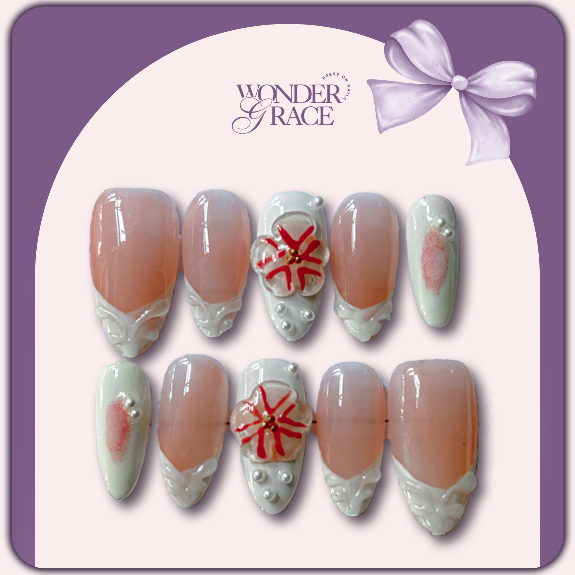 Bold yet delicate, Dripping Petals is a handcrafted press-on nail set that turns floral beauty into modern art. Featuring soft nude bases with cascading floral accents and shimmering details, this almond-shaped design gives the illusion of petals dripping gracefully across each nail. Perfect for special occasions, weddings, or when you want your manicure to be both romantic and statement-making.