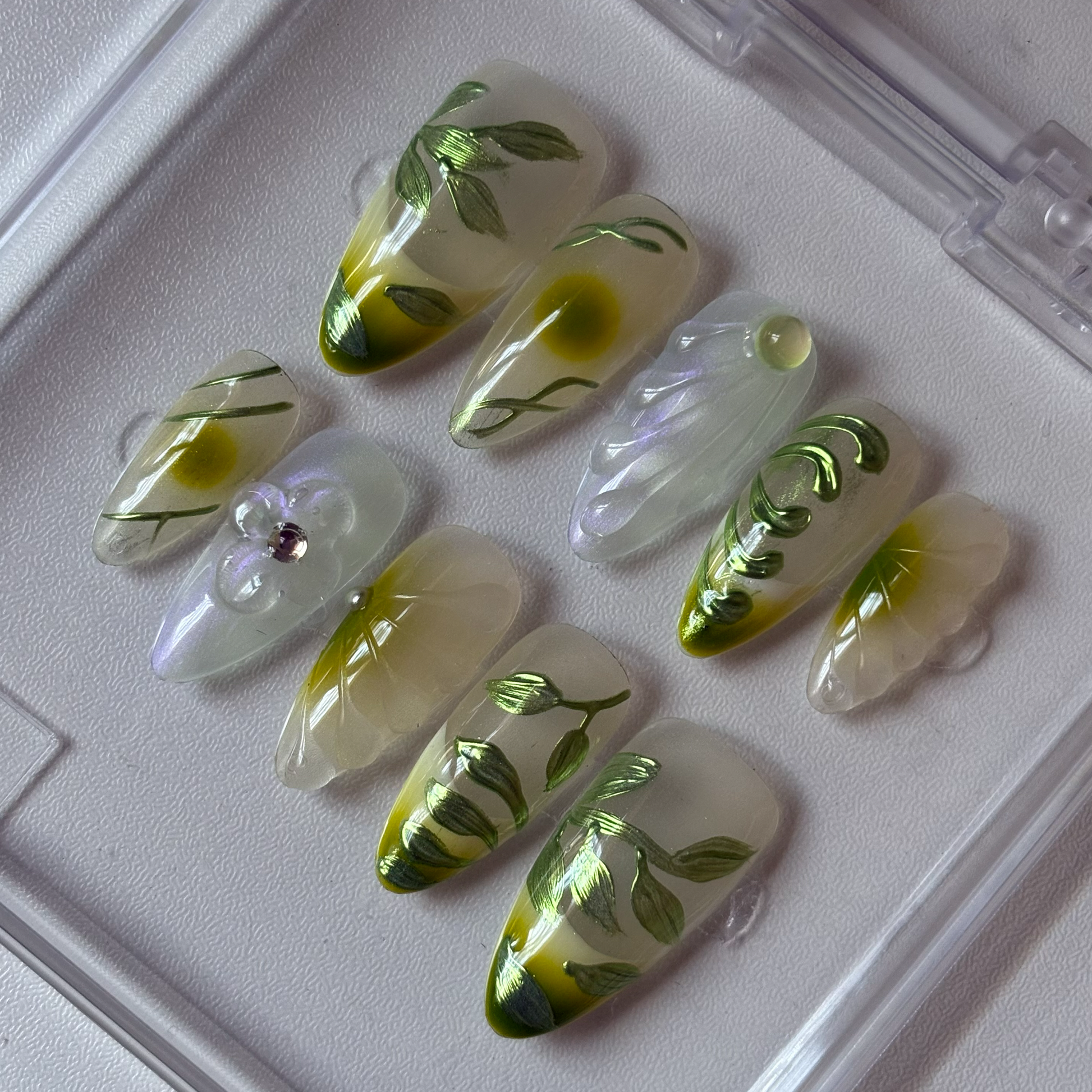 Bring nature to your fingertips with Green Botanical, a handmade almond-shaped press-on nail set designed with fresh green tones, delicate botanical leaf patterns, and subtle purple accents. This earthy yet elegant design is perfect for spring, summer, or anyone who loves refined, nature-inspired nail art.