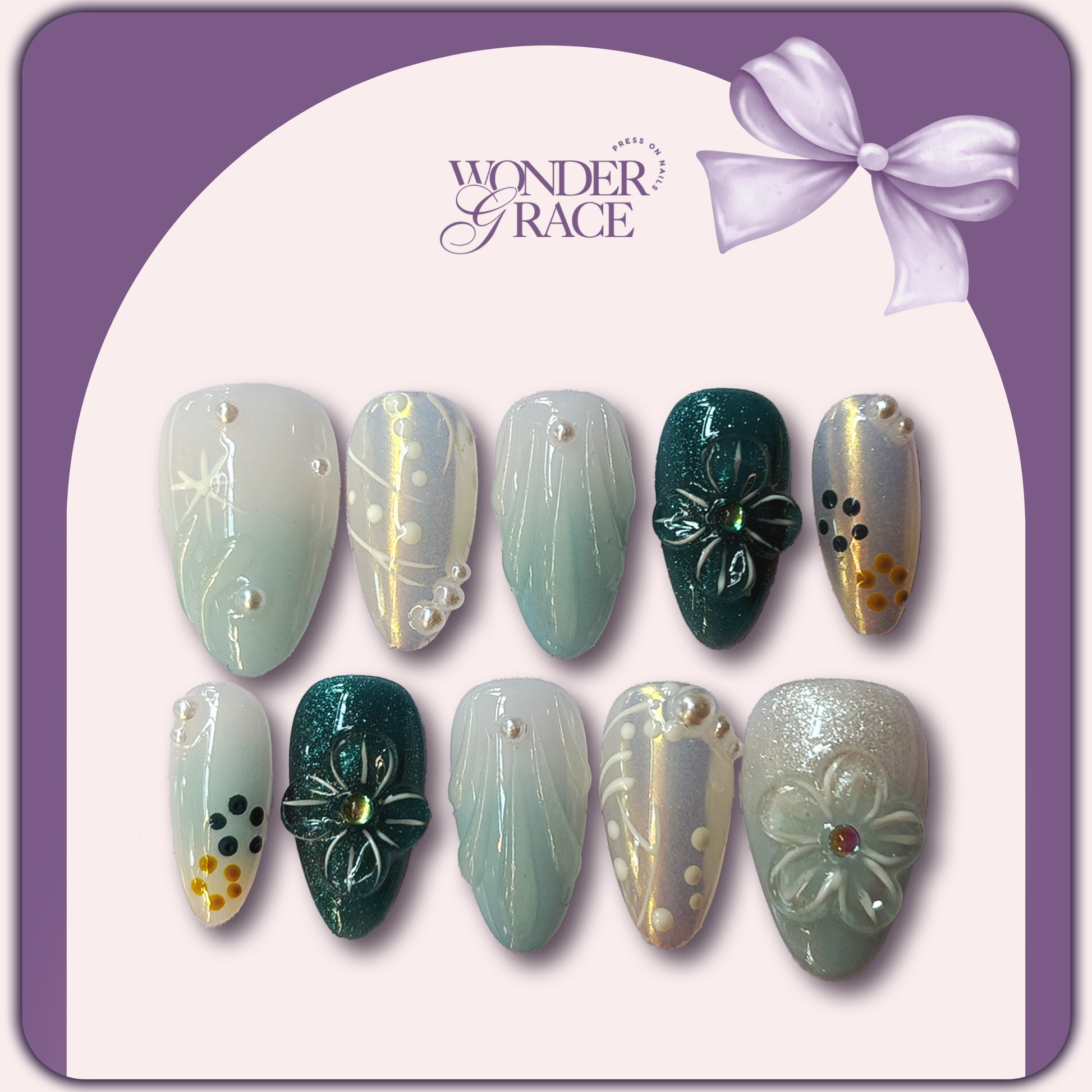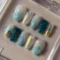 Whisper elegance with Jade Whisper, a handcrafted press-on nail set designed to blend serenity and artistry. Featuring soft jade green and white tones, delicate 3D floral accents, pearl embellishments, and shimmering details, this almond-shaped set captures refined beauty with a fresh, nature-inspired touch. Perfect for weddings, parties, or elevating your everyday style with a unique statement.