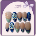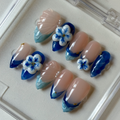 Elegant yet playful, Navy Bloom is a handcrafted press-on nail set that captures the charm of ocean-inspired beauty. Featuring nude bases with navy blue and teal French tips, this almond-shaped design is elevated with 3D floral accents, seashell details, and delicate gold embellishments. Perfect for summer events, seaside getaways, or adding a refreshing pop of color to your everyday look, Navy Bloom blends coastal elegance with artisanal craftsmanship.