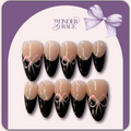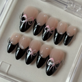 Elevate your style with Noir Bow, a handcrafted press-on nail set designed to balance bold sophistication with feminine charm. Featuring sleek black French tips on a nude base, this almond-shaped set is beautifully accented with delicate pink bows and lustrous pearl embellishments. Perfect for date nights, parties, or adding a chic touch to your everyday look, Noir Bow captures timeless elegance with a playful twist.