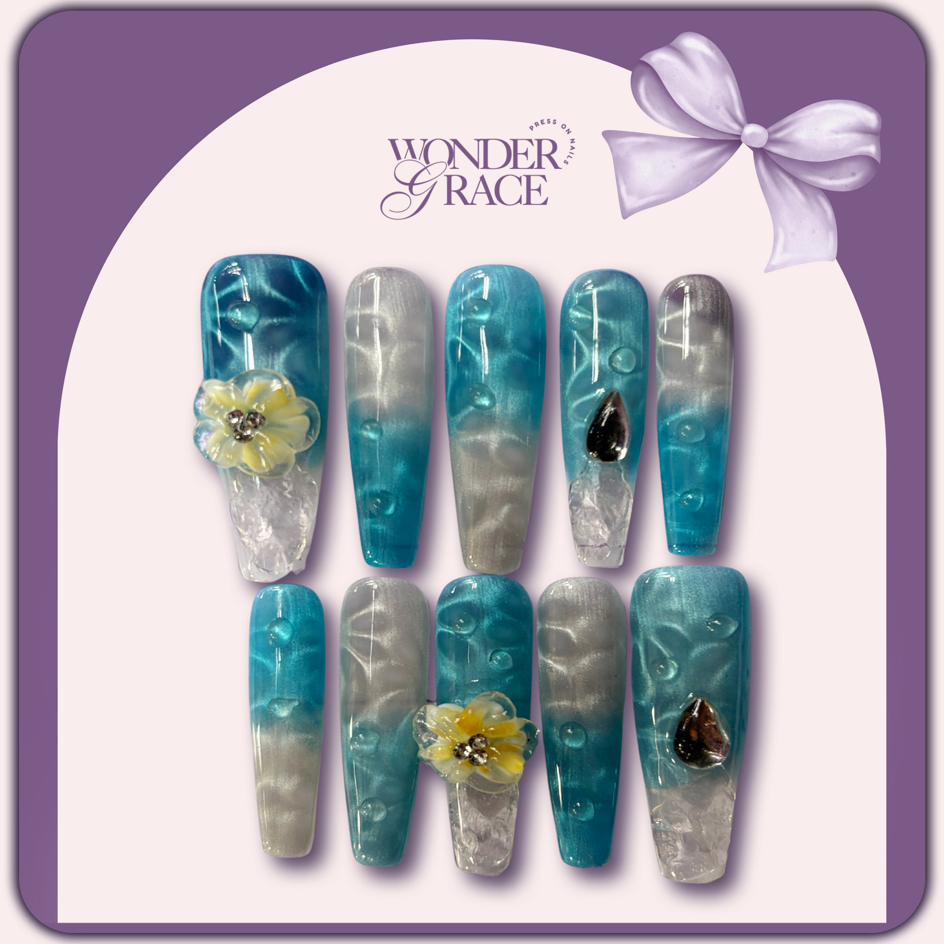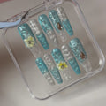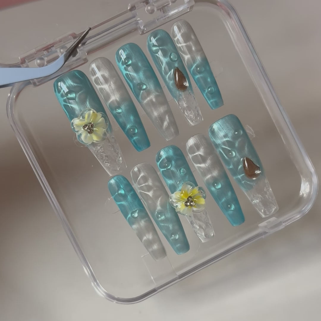 Immerse yourself in elegance with Sea Blossom, a handcrafted press-on nail set inspired by the ocean’s serenity and the delicate beauty of blooming florals. Featuring ocean-blue tones, crystal-clear accents, and dimensional yellow blossoms, this long coffin design strikes the perfect balance between bold artistry and graceful femininity.