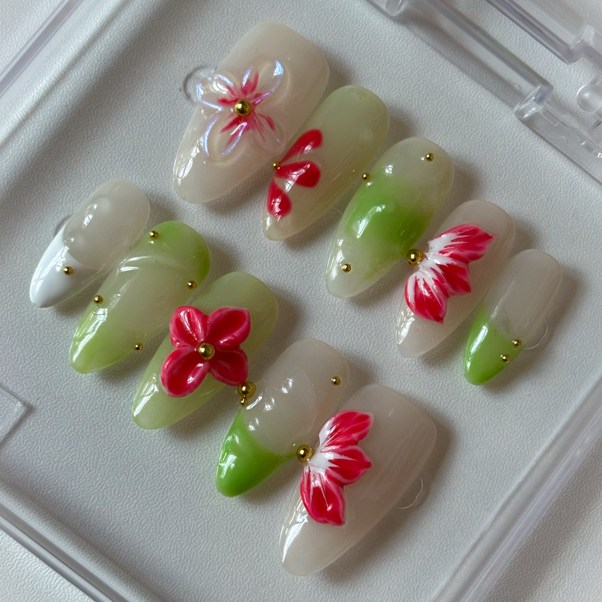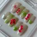 Add a touch of nature-inspired elegance with Tropical Vine, a handcrafted almond-shaped press-on nail set designed to capture the freshness of the tropics. Featuring a soft nude and green gradient base, bold 3D red floral accents, and subtle gold embellishments, this design delivers a vibrant yet refined finish. Perfect for spring, summer, or any occasion where you want your style to bloom.