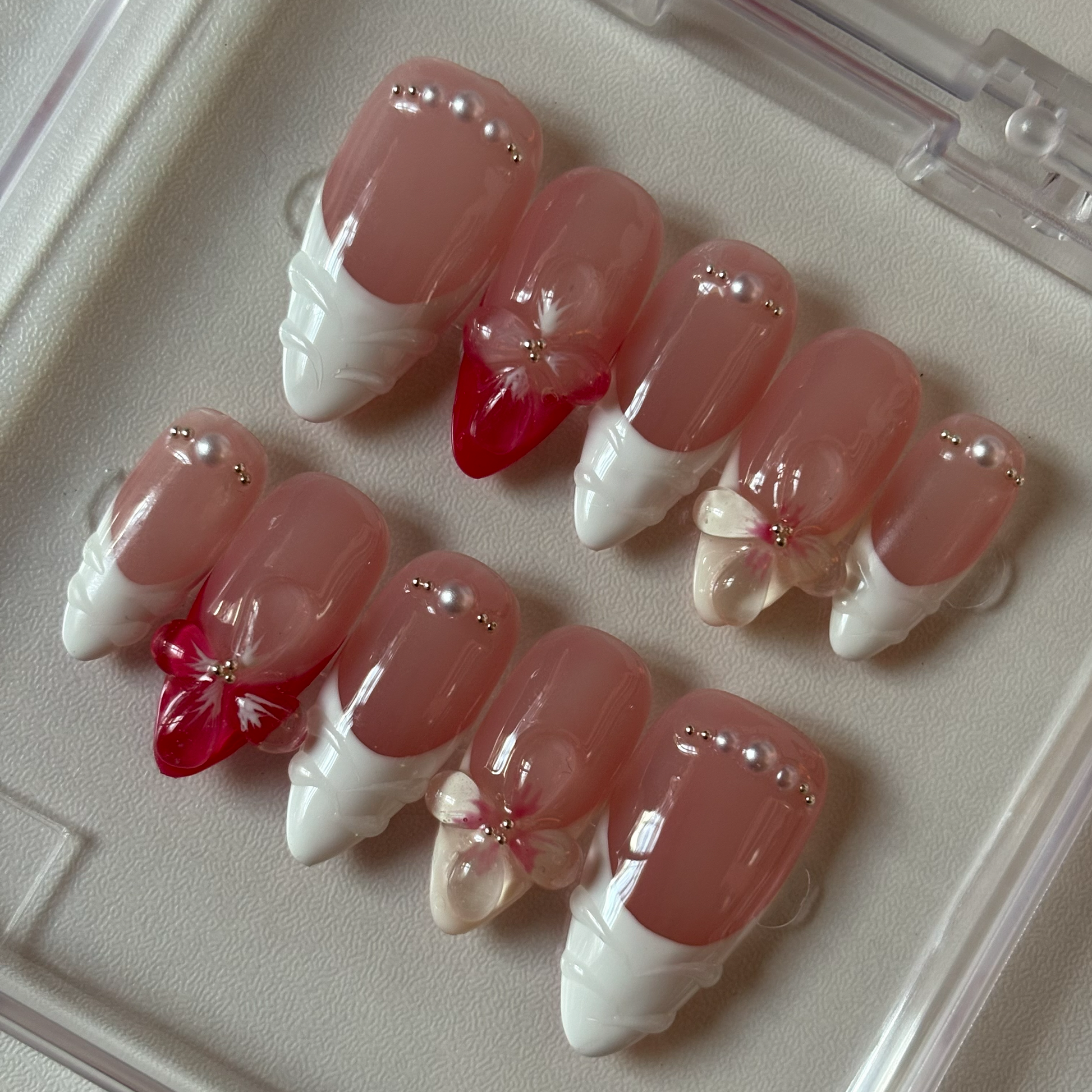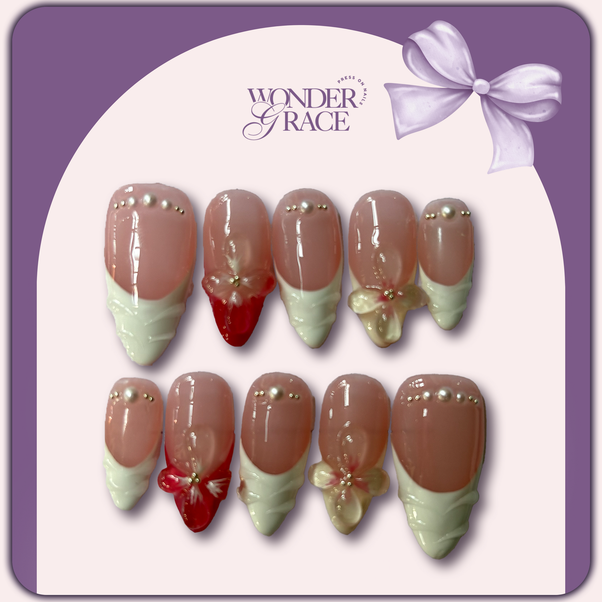 Soft, graceful, and timeless, White Petals is a handcrafted press-on nail set designed to capture pure elegance. Featuring delicate white floral accents paired with a glossy nude base, this almond-shaped set adds a touch of effortless sophistication to any look. Whether you’re walking down the aisle, attending a special event, or elevating your everyday style, White Petals is the perfect blend of minimalism and charm.